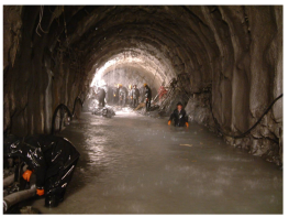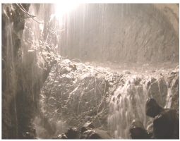 有時遇到填滿飽含水分的充填物溶槽,坑道掘進至邊緣時,充填物不斷涌入坑道,難以遏止,甚至地表開裂下沉,山體壓力劇增;有的溶洞、暗河迂回交錯、分支錯綜復(fù)雜、范圍寬廣,處理十分困難。