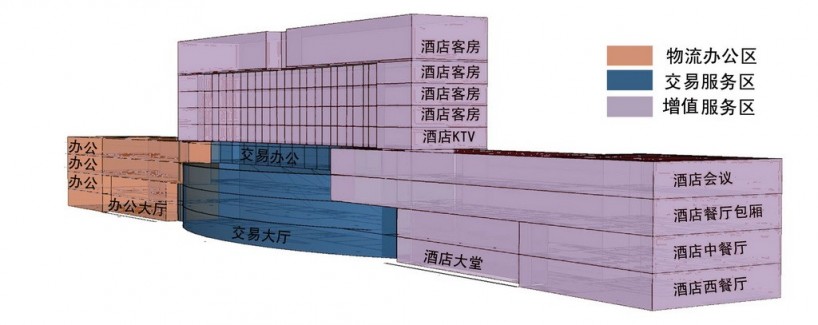 區(qū)別于傳統(tǒng)鐵路貨場散點(diǎn)式的的生產(chǎn)配套房屋布局規(guī)劃,嘉寶物流園區(qū)在西南角集中建設(shè)了一幢九層高,總建筑面積約4.2萬平米的嘉寶物流大廈,作為園區(qū)的標(biāo)志性建筑物及綜合性服務(wù)大樓,其功能不緊緊涵蓋了服務(wù)物流園的基本生產(chǎn)管理功能,同時也承擔(dān)了為嘉寶物流園區(qū)提供各項(xiàng)增值服務(wù)的經(jīng)濟(jì)開發(fā)功能(圖9)。其主要功能包括:網(wǎng)上交易、流通加工、貨運(yùn)代理、貿(mào)易、金融、工商、咨詢、會議餐飲、酒店住宿等各種綜合服務(wù)性功能(圖10)。集約式的規(guī)劃布局既可以充分提高園區(qū)土地利用率及生產(chǎn)組織管理效率,還可以提升園區(qū)室內(nèi)外環(huán)境品質(zhì),統(tǒng)領(lǐng)園區(qū)的整體形象。