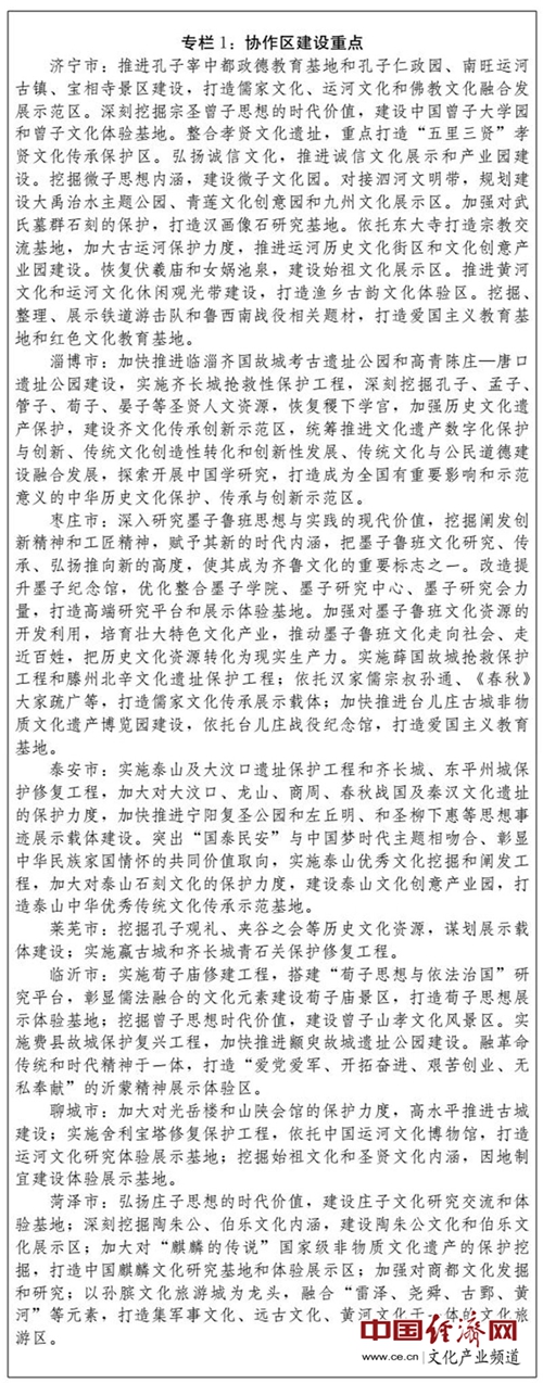 (一)強化中央政策支持。建立部省聯席會議制度,積極爭取成立由中央宣傳部、國家發展改革委、文化部等有關部委以及山東省、濟寧市等共同組成的部省聯席會議,定期會商示范區規劃建設中的重大事項,統籌部署、協調聯動,突出重點、集成資源,提升示范區建設的綜合效應。中央文化產業發展專項資金和國家文物保護專項資金對示范區內符合條件的項目給予積極支持。制定針對示范區的特殊扶持政策。