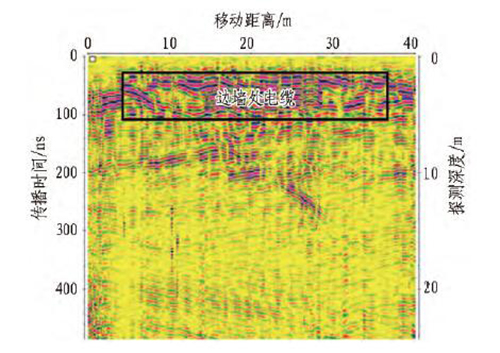 隧道內電纜對地質雷達探測干擾較大,容易造成誤判。電纜通常布置在隧道邊墻,在進行底板下方不良地質體探測時,測線方向與電流方向平行,天線的極化方向垂直于電流方向,如圖4 所示,其在地質雷達圖像上表現為1 組反射強烈的水平同相軸[14]。在底板探測時,需要注意輸電線路與測線之間的相對位置,并記錄下來。