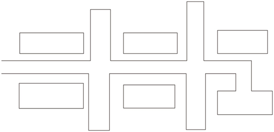 混合式布置形式同時(shí)具有環(huán)狀式和盡頭式兩種布置形式的特點(diǎn)。在滿足運(yùn)輸?shù)囊髼l件下,既能兼顧貨流、人流的通暢。又能較好的適應(yīng)廠區(qū)地形、地質(zhì)條件。其布置形式比較靈活,可適用于各種類型的企業(yè),如圖所示。