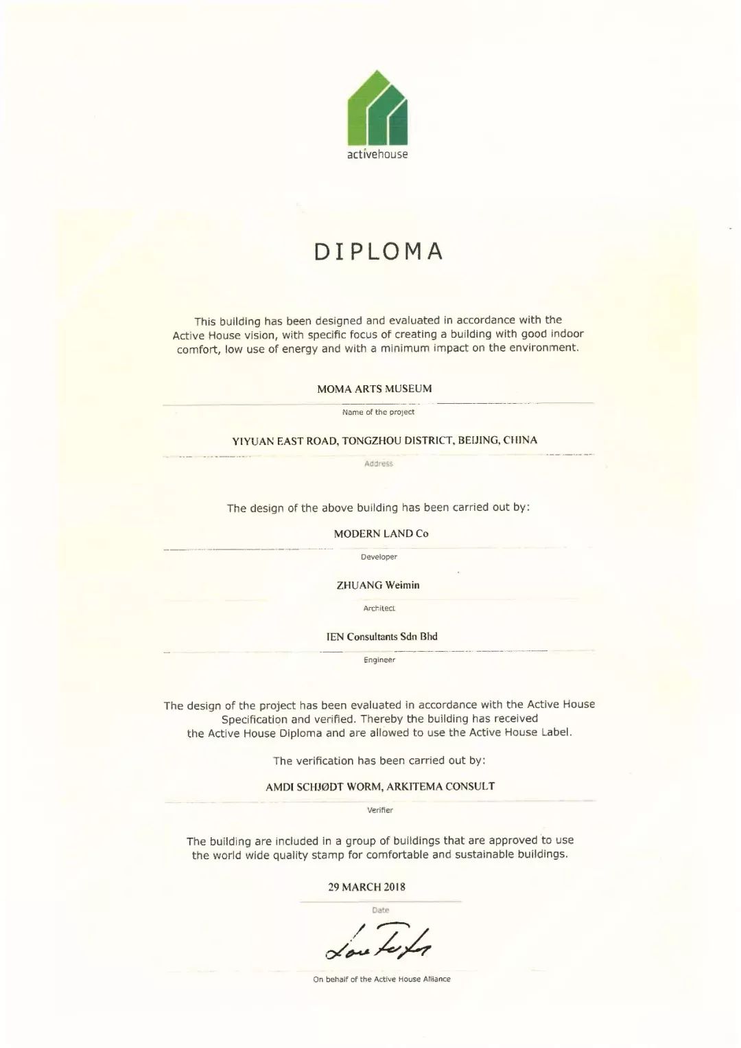 清華大學建筑設計研究院設計項目——當代建筑藝術博物館成為中國獲得主動式建筑ACTIVE HOUSE國際聯盟認證的第一棟博物館建筑。同時這也是清華大學建筑設計研究院第一個獲得主動式建筑認證的設計項目。(AH于今年開始中國項目的國際認證評估,目前中國獲得AH國際認證的建筑只有當代建筑藝術博物館和威盧克斯辦公樓)。