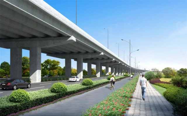 該快速路主線與鏡水路立交銜接,采用高架形式自西向東先后跨越大越路、綠云路、解放路、中興大道、越東路,二期工程延伸至越興路。 另外, 保留現(xiàn)狀鏡水路立交、大越路輔道立交,并新增綠云路和越東路2處全互通立交,沿線設置6對上下坡匝道與地面道路銜接。