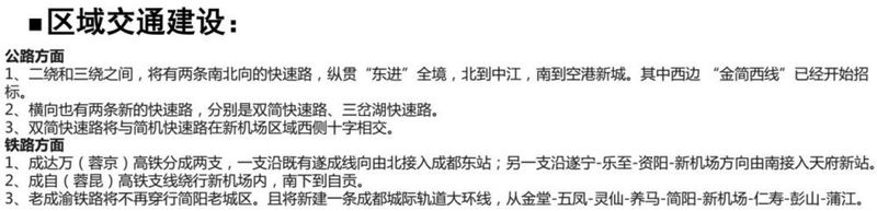 依托成巴高速、成南高速、天府國際機場高速等“六射一環(huán)”高速公路輻射區(qū)域,帶動區(qū)域協(xié)同發(fā)展。建設金簡仁快速、中金簡快速、成資快速等多條區(qū)域快速通道,帶動沿線城鄉(xiāng)發(fā)展。