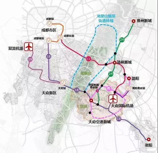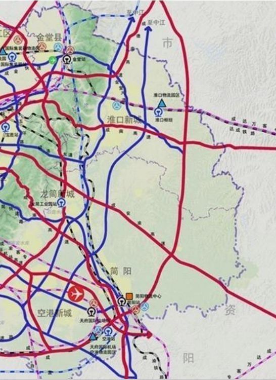 依托既有成渝鐵路、達成鐵路和規(guī)劃貨運外繞線,連接青白江國際鐵路港,融入 “ 蓉歐+ ” 。淮州新城預留國際鐵路港功能。規(guī)劃建設蓉昆高鐵成自段、成達萬高鐵等7條出川高鐵,融入國家高鐵網絡。推動成渝客專、遂成鐵路和蓉昆高鐵成自段等鐵路公交化運營,強化區(qū)域協(xié)作。依托18號線、13號線等軌道快線,實現(xiàn)中心城區(qū)和東部城市新區(qū) “ 半小時 ” 到達機場。