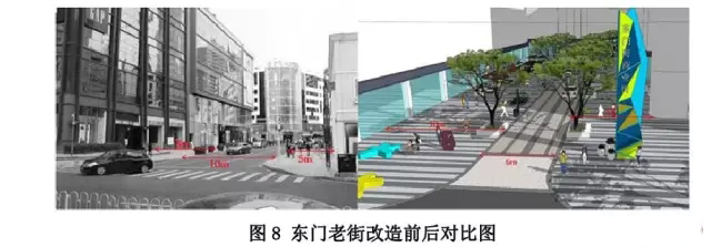 ● 東門老街:機(jī)動(dòng)車道由10 米壓縮至6 米,兩側(cè)人行道分別從5 米加寬至7 米,從8米加寬至10米。