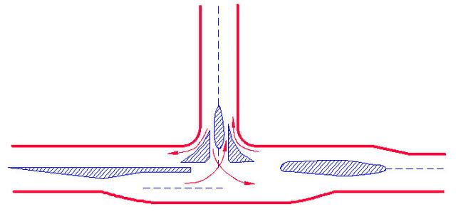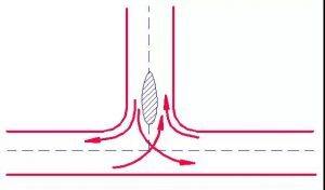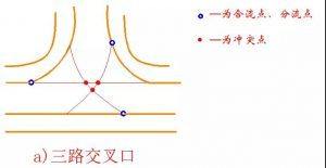三路相交的交叉口,3個沖突點、3個合流點、分流點。