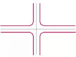 主要公路與次要公路(為縣鄉公路或四級公路)的T形交叉,當轉彎交通量較大而會導致直行車輛的過分減速時,應采用加寬式T形交叉。主要公路右轉彎交通量較大者,采用該設計形式。