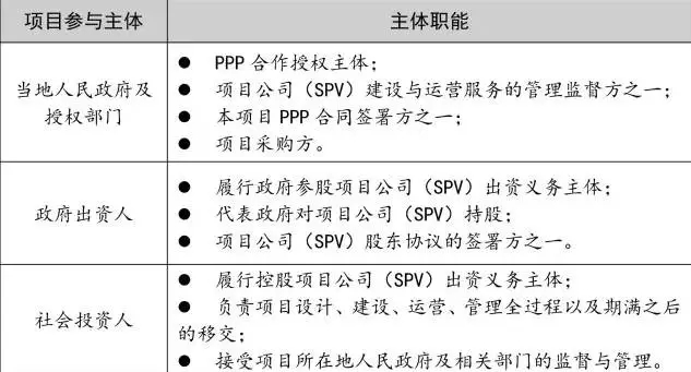 農(nóng)村生活污水治理工程PPP項目參與主體主要包括項目所在地人民政府及授權部門、政府出資人及社會投資人。本項目參與主體的具體職能見下表所示: