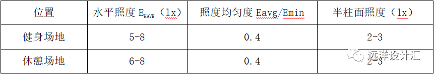 (3)健身場地照明要有足夠的水平照度和垂直照度,同時要有足夠的均勻度。休閑場地照明應滿足交流、觀賞和安全需求。見表3-2。