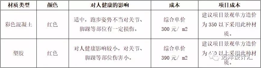 根據(jù)鋪裝材質(zhì)、顏色對人健康的影響,綜合項目成本控制,居住區(qū)慢跑步道鋪裝材質(zhì)選擇見下表3-1: