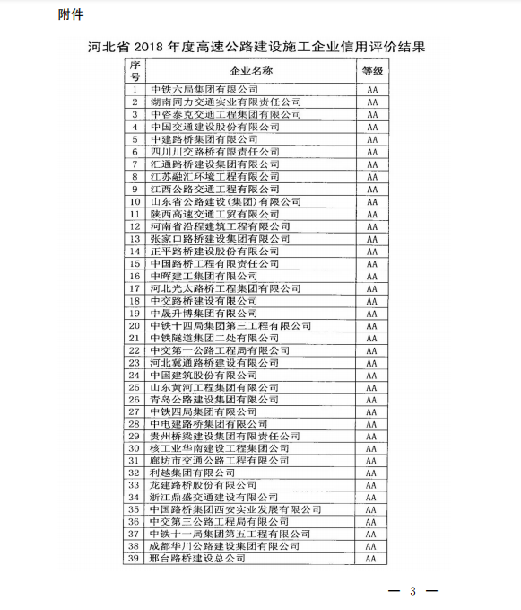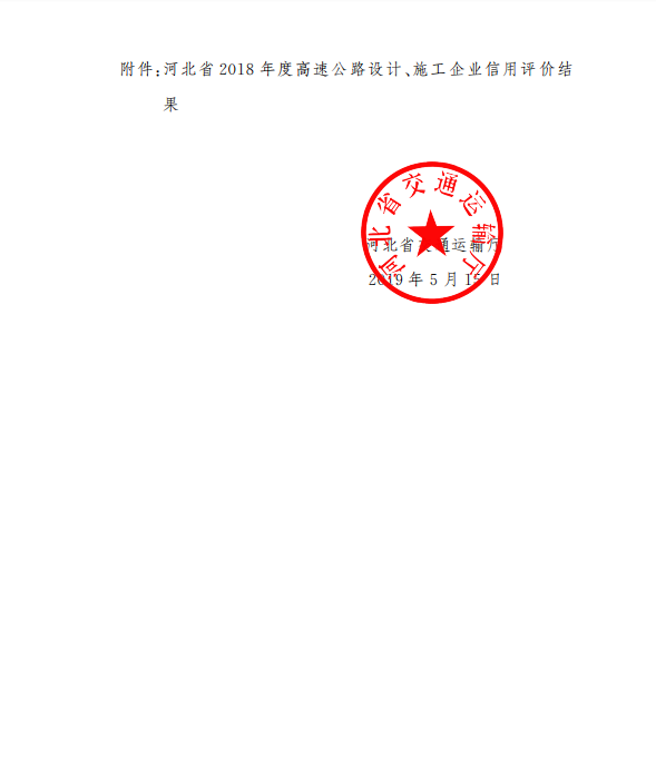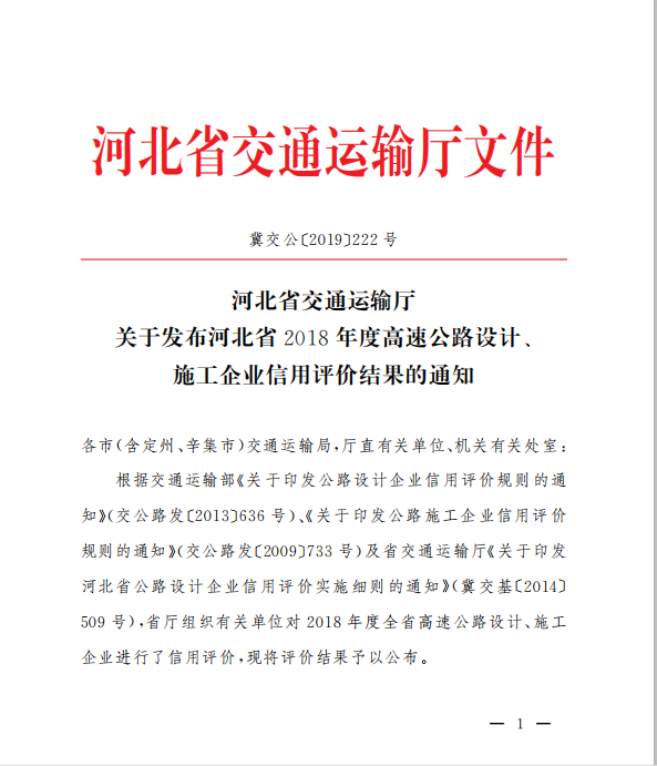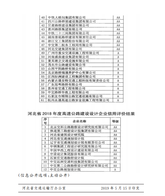 河北省交通運(yùn)輸廳關(guān)于發(fā)布河北省2018年度高速公路設(shè)計(jì)、施工企業(yè)信用評(píng)價(jià)結(jié)果的通知