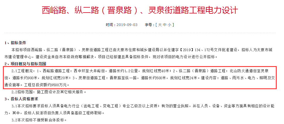 根據(jù)招標(biāo)顯示,本招標(biāo)項(xiàng)目西峪路、縱二路(晉泉路)、靈泉街道路工程已由太原市住房和城鄉(xiāng)建設(shè)委員會(huì)以并住建字【2019】134號(hào)和172號(hào)文件批準(zhǔn)建設(shè),招標(biāo)單位太原市城市建設(shè)管理中心,建設(shè)資金為本級(jí)市政府籌措解決,項(xiàng)目出資比例為100%。