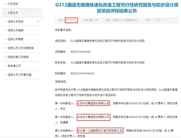 今年3月1日,無錫市城市重點項目管理中心發布的《G312國道無錫境快速化改造工程可行性研究報告與初步設計項目項目評標結果公示》顯示,該項目標段的第一中標候選人為中設股份,第二中標候選人為中設集團,第三中標候選人為中交第一公路勘察設計研究院有限公司。