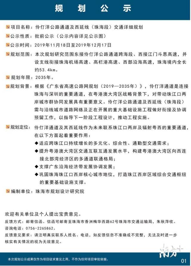18日,珠海市交通運(yùn)輸局官網(wǎng)公布關(guān)于《伶仃洋公路通道及西延線(珠海段)交通詳細(xì)規(guī)劃》(下稱《規(guī)劃》)公開(kāi)征求意見(jiàn)的公告,向社會(huì)征求意見(jiàn)意見(jiàn)和建議。