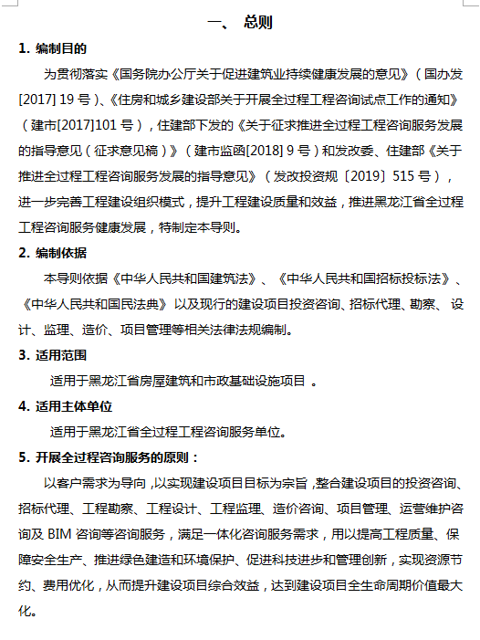 為貫徹落實(shí)《國(guó)務(wù)院辦公廳關(guān)于促進(jìn)建筑業(yè)持續(xù)健康發(fā)展的意見(jiàn)》(國(guó)辦發(fā)[2017]19號(hào))、《住房和城鄉(xiāng)建設(shè)部關(guān)于開(kāi)展全過(guò)程工程咨詢?cè)圏c(diǎn)工作的通知》(建市[2017]101號(hào)),住建部下發(fā)的《關(guān)于征求推進(jìn)全過(guò)程工程咨詢服務(wù)發(fā)展的指導(dǎo)意見(jiàn)(征求意見(jiàn)稿)》(建市監(jiān)函[2018]9號(hào))和發(fā)改委、住建部《關(guān)于推進(jìn)全過(guò)程工程咨詢服務(wù)發(fā)展的指導(dǎo)意見(jiàn)》(發(fā)改投資規(guī)〔2019〕515號(hào)),進(jìn)一步完善工程建設(shè)組織模式,提升工程建設(shè)質(zhì)量和效益,推進(jìn)黑龍江省全過(guò)程工程咨詢服務(wù)健康發(fā)展,特制定本導(dǎo)則。