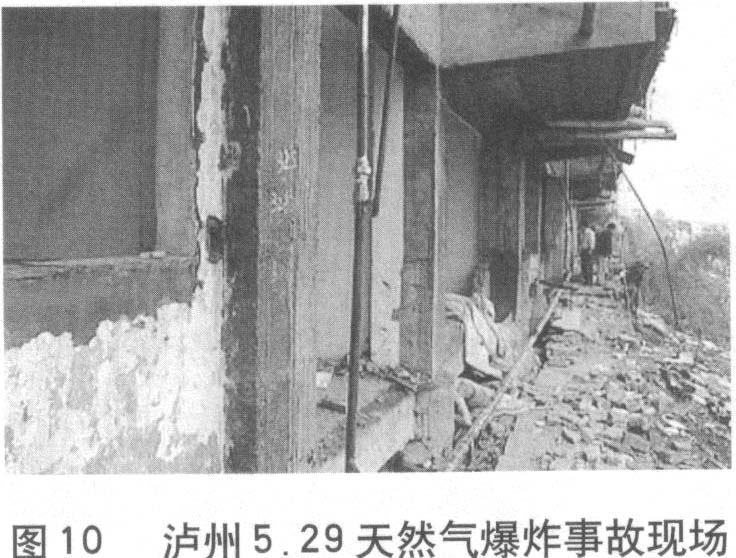 2、2004年5月29日19時45分,瀘州市納溪區炳靈路15號居民樓人行道下,突然發生劇烈的天然氣爆炸事故,造成5人死亡,35人不同程度受傷,附近一樓10余居民的家園被毀,臨街一樓12間門面受損,近50米長范圍內的街道被震得一片狼藉。事故的原因是:管道局部的防腐層受到外力破壞,導致腐蝕穿孔,該位置正好位于民樓附一層與道路堡坎形成的窄縫中,地勢較低,聚集大量天然氣,因氣候變化因素發生膨脹而釋放至窄縫外,與空氣形成爆炸性氣體,遇人行道上不明火源而引發爆炸。