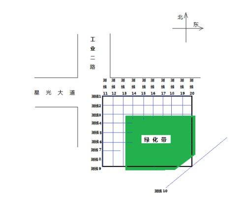 以工業(yè)二路與星光大道路口處左幅41#墩位為例,按業(yè)主要求及場(chǎng)地實(shí)際情況,本次勘察共布置測(cè)線20條,對(duì)被測(cè)區(qū)域進(jìn)行網(wǎng)格劃分,測(cè)區(qū)內(nèi)管線測(cè)線布置如下圖所示。(其它各墩位測(cè)線以此類推)