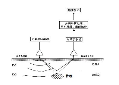 地質(zhì)雷達(dá)探測(cè)地下空洞是利用空洞與土層的電性差異來(lái)實(shí)現(xiàn)的。由于路面、土層、空洞、管線是不同的材料構(gòu)成,不同材質(zhì)間的接觸面及同一種材質(zhì)內(nèi)部不連續(xù)面都是良好的雷達(dá)波反射界面(即管線、空洞與土層接觸面、路面與土層的分界面等)。當(dāng)雷達(dá)波向下傳播經(jīng)過(guò)這些界面時(shí),都會(huì)發(fā)生不同程度的反射、折射和散射,產(chǎn)生不同程度的波能吸收和衰減,集中反映在波形和波阻特征變化上。分析研究接收回波的特征差異,就可以揭示路面地下管線特征。