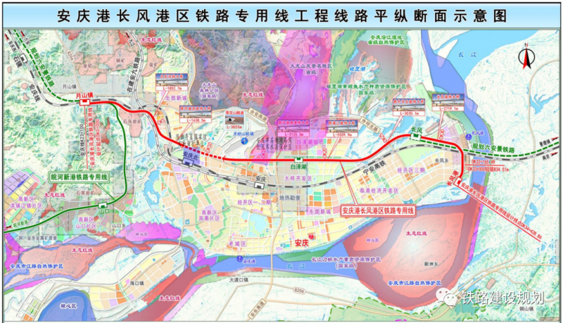 長(zhǎng)風(fēng)港區(qū)鐵路專用線主要承擔(dān)長(zhǎng)風(fēng)港區(qū)鐵水聯(lián)運(yùn)以及臨港企業(yè)的運(yùn)輸任務(wù),是全國(guó)十二個(gè)鐵水聯(lián)運(yùn)示范項(xiàng)目之一。項(xiàng)目位于安徽省安慶市懷寧縣、宜秀區(qū)、大觀區(qū)、迎江區(qū)境內(nèi),線路自合九鐵路安慶線新設(shè)月山鎮(zhèn)站引出,向東沿城市規(guī)劃預(yù)留鐵路廊道經(jīng)宜秀區(qū)、大觀區(qū)、迎江區(qū),終至長(zhǎng)風(fēng)港區(qū),通過(guò)合九鐵路、安慶線與國(guó)鐵路網(wǎng)聯(lián)通。正線全長(zhǎng)34.36公里,設(shè)月山鎮(zhèn)站、長(zhǎng)風(fēng)港站2座車站。建設(shè)工期2年。工程為新建國(guó)鐵Ⅳ級(jí)單線內(nèi)燃鐵路專用線,設(shè)計(jì)時(shí)速80km/h,設(shè)車站2座,設(shè)橋梁4座/13.706km、隧道1座/3.855km,橋隧比約60.9%。