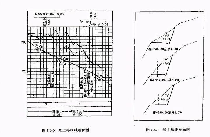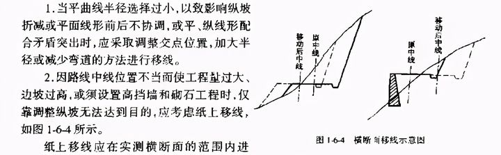 在公路定線過程中,往往由于定線時考慮不周、地形條件限制或其他原因,難免產(chǎn)生因平面中線位置不當致使工程量過大、標準或線形不夠理想等缺點。此時可在分析研究已定路線平、縱、橫圖紙資料的基礎(chǔ)上,考慮移動路線,使設(shè)計達到經(jīng)濟合理的要求,它對提高設(shè)計質(zhì)量,降低工程費用起著一定的作用。當路線設(shè)計出現(xiàn)以下情況時,應考慮紙上移線。