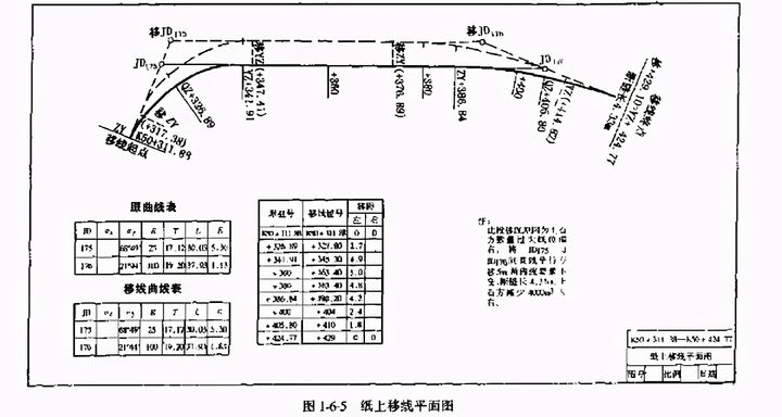 (1)繪制移線路段大比例尺(一般采用1:200—1:500)路線平面圖,注出交點編號、曲線起、終點以及各樁位置,如圖1-6-5所示。