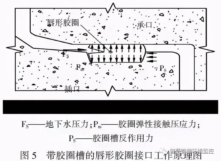 帶膠圈槽接口如圖5 所示。膠圈三相受擠,增加反力PS,加大了膠圈對(duì)工作面表面的擠壓接觸應(yīng)力,有利于提高接口的抗?jié)B能力。因此,在接口抗?jié)B要求嚴(yán)格的管道中建議采用帶膠圈槽接口。在中、大型地下綜合管廊工程中應(yīng)優(yōu)先選用帶膠圈槽楔形膠圈密封接口。