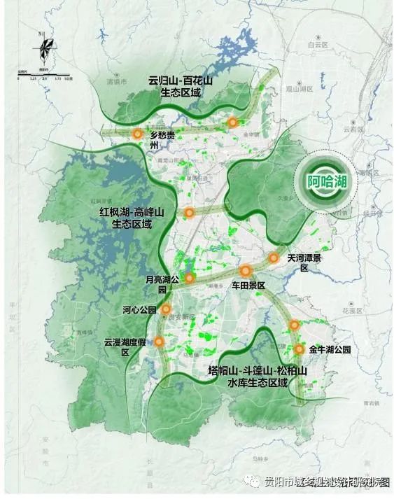 四片:紅楓湖-高峰山生態區域、云歸山-百花山生態區域、阿哈湖生態區域、塔帽山-斗篷山-松柏山水庫生態區域,強化區域生態保育功能,發揮區域生態基底作用。
