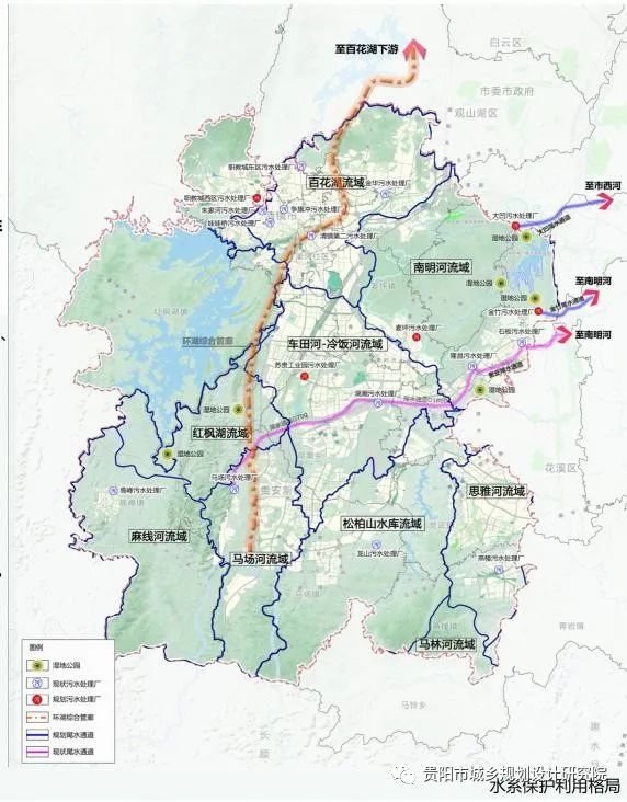 尾水收集:已建馬場至湖潮至南明河的貴安尾水通道,規劃沿紅楓湖、百花湖新建環湖綜合管廊,收集沿線朱家河、馬場、高峰、金華等10座污水處理廠尾水,排放至百花湖下游,減輕污水尾水對紅楓湖及百花湖的污染,排放標準為準Ⅳ類水,計劃遠期建設完成。新增金竹環阿哈湖南部截污管廊、大凹尾水通道,尾水采取跨流域排放模式,分別排放至市西河及南明河,減輕污水尾水對阿哈湖的污染,排放標準為準Ⅳ類水,計劃近期建設完成。
