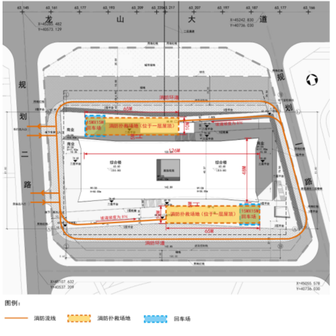 設計難點:本工程為高度為不大于50米的一類高層公共建筑,由于本建筑定位為安陽市地標性建筑,形象上要求將塔櫻布置在托起的一層屋頂平臺中部,因此在±0.000標高處無法滿足塔樓的消防撲救。