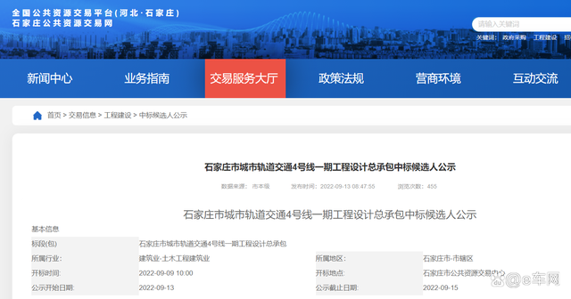 石家莊市城市軌道交通4號線一期工程設(shè)計(jì)總承包中標(biāo)候選人公示