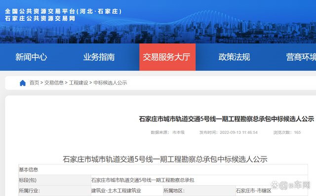 石家莊市城市軌道交通5號線一期工程設(shè)計(jì)總承包中標(biāo)候選人公示
