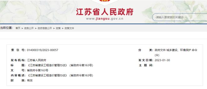 江蘇省人民政府令第 163 號(hào)《江蘇省建設(shè)工程造價(jià)管理辦法》已于2023年1月27日經(jīng)省人民政府第1次常務(wù)會(huì)議討論通過,現(xiàn)予公布,自2023年4月1日起施行。