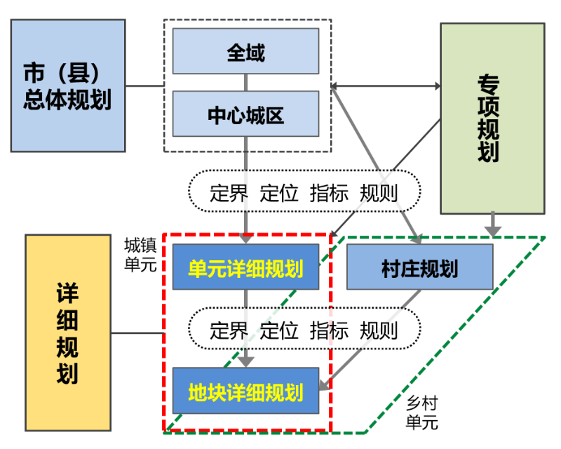 (二)確定單元詳細(xì)規(guī)劃法定地位和作用。鑒于原控規(guī)單元規(guī)劃法定地位和作用不明情況,提出單元詳細(xì)規(guī)劃是落實(shí)總體規(guī)劃目標(biāo)要求、銜接專項規(guī)劃空間需求、指導(dǎo)地塊詳細(xì)規(guī)劃的規(guī)劃層次,是承接國土空間總體規(guī)劃強(qiáng)制性內(nèi)容的法定規(guī)劃。并明確單元詳細(xì)規(guī)劃的法定作用,單元詳細(xì)規(guī)劃中已確定公益性設(shè)施用地具體位置和范圍的,已明確地塊控制要求的,可作為規(guī)劃許可依據(jù)。
