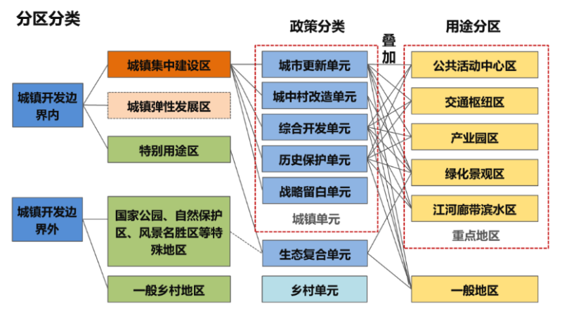 (一)搭建用途分區(qū)疊加分類政策多場景。立足國土空間全域全要素規(guī)劃管控要求,協(xié)調(diào)城鎮(zhèn)開發(fā)邊界內(nèi)外關(guān)系,劃分一般用途區(qū)和重點(diǎn)用途區(qū),其中重點(diǎn)區(qū)包括公共活動中心區(qū)、交通樞紐區(qū)和江河廊帶濱水區(qū)等。在用途分區(qū)基礎(chǔ)上,疊加各類政策,明確城市更新、城中村改造、綜合開發(fā)、歷史保護(hù)、生態(tài)復(fù)合和戰(zhàn)略留白等類型單元,進(jìn)行分區(qū)分類指引,實(shí)現(xiàn)土地利用全生命周期、全利用方式的管控,保障相關(guān)政策得以落地。