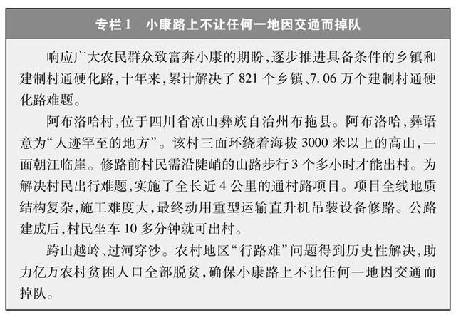 通達深度全面提升。實現了具備條件的約3萬個鄉鎮、超過50萬個建制村全部通硬化路(專欄1)。有序實施了較大人口規模自然村(組)通硬化路建設。旅游景點、產業園區、資源礦產等農村地區主要經濟節點的通硬化路問題基本解決。偏遠地區尤其是山區農民群眾對外出行更加便捷。
