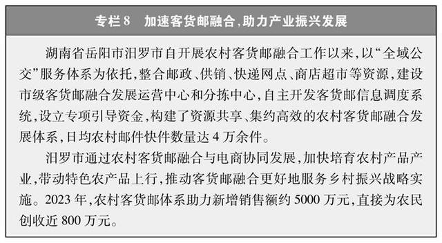 加快推進農村客貨郵融合發展。為統籌解決農村客運可持續運營、快遞下鄉進村和農產品出村進城難題,發布《關于加快推進農村客貨郵融合發展的指導意見》,堅持“政府引導、市場主導”,深入推進農村客貨郵運行機制、基礎設施、運輸線路、運營信息等共建共享,加強資源統籌利用,推動融合發展(專欄8)。截至2023年底,所有省份和超70%地級以上城市建立了交通運輸、郵政、商務、供銷等部門共同參與的工作機制,共開通農村客貨郵合作線路1.1萬余條,共建成縣、鄉、村三級客貨郵服務站點9萬余個,形成“客運郵路”“貨郵同網”等典型模式,有效鞏固了通客車成果,農村物流、郵政快遞降本增效取得明顯進展,帶動了農村電商、特色產業等蓬勃發展。