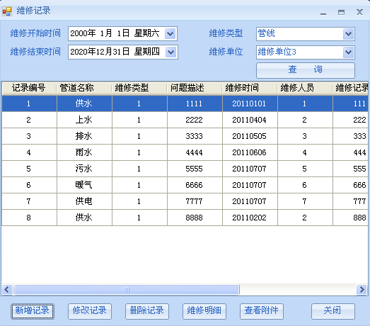 4.對各種管線的維護信息做到及時統(tǒng)計,使管理人員能及時掌握管線的運行情況,對管線進行動態(tài)維護和管理。 實現(xiàn)各種管線管理維護的績效分析(質量、效率、成本)。