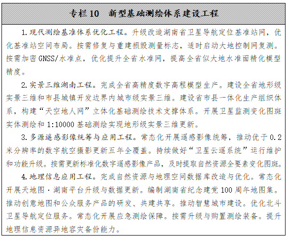 推進新型基礎測繪體系建設。在做好全省1:10000地形圖和市縣城鎮(zhèn)開發(fā)邊界內1:500地形圖生產更新的基礎上,以“滿足要求、貼近需求”為導向,推進新型基礎測繪體系和實景三維湖南工程建設,建立以實景三維湖南為核心的新型基礎測繪產品體系,帶動生產組織體系、標準政策體系、技術支撐體系和應用服務體系的全面重構。按照“試點驗證、按需精化、以用促建、省市聯(lián)動”的思路,基本建成覆蓋全面、更新及時、管控精準、立體直觀、承載力強的實景三維湖南和省級統(tǒng)籌、聯(lián)動更新、開放共享、按需服務的湖南省新型基礎測繪體系。